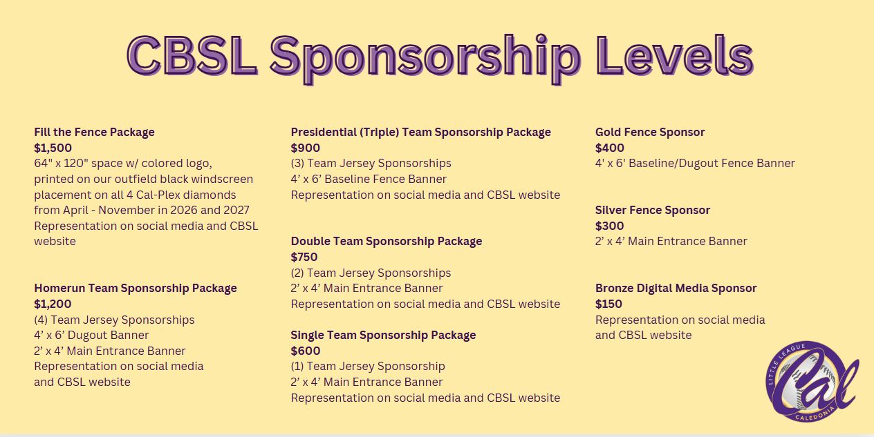 Caledonia Baseball Softball League is a community funded, registered 501(c)(3) non-profit organization that depends on registrations, donations, and sponsorships to fund the many programs offered by the league. These funds are used for purchasing and maintaining gear, field maintenance and improvements, league operations, player scholarships, and league sponsored events. Below you will finds ways to support of our efforts through sponsorship, donation and employee matching.